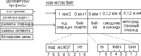 Приведенный на рис. 1 формат машинной команды является самым общим. Максимальная длина машинной команды — 15 байт. Реальная команда может содержать гораздо меньшее количество полей, вплоть до одного — только КОП.
